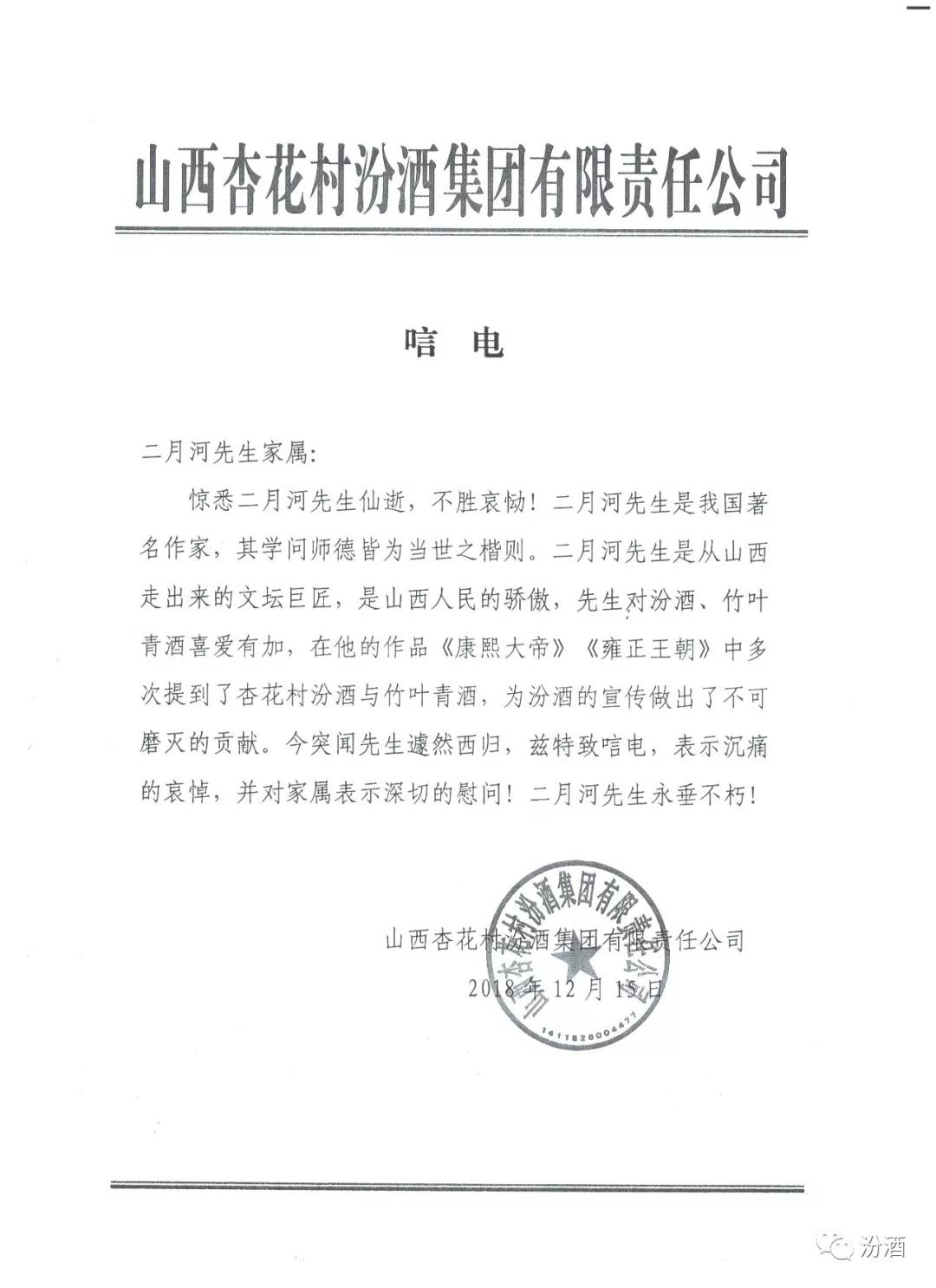 2018年12月15日,闻悉二月河先生(本名凌解放)溘然长逝,我们悲痛万分。二月河先生是汾酒集团的老朋友,其作品中曾多次提到汾酒,为汾酒文化传播发挥了重要作用。为了表达哀悼之情,感恩之情,我们第一时间向先生家人致唁电,并派专人送了花圈。