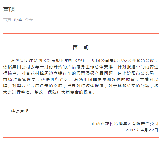 汾酒集团注意到《新京报》的相关报道,集团公司高层已经召开紧急会议,依据集团公司去年十月份开始的产品瘦身工作总体安排,针对报道中的内容进行核查。对杏花村镇周边商铺存在的假冒侵权产品问题,请求汾阳市公安局、市场监督管理局,依法进行查处。汾酒集团非常感谢媒体的监督,本着对品牌、对消费者高度负责的态度,严肃对待媒体报道,对于能够核实的问题,将大力进行整治、整改,保障广大消费者的权益。